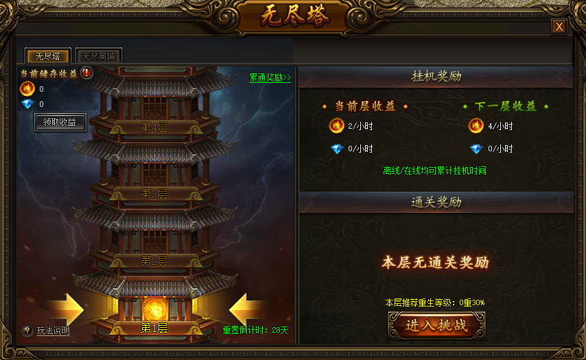 无尽塔每层包含5只小怪和1只boss,击杀小怪后刷新boss,1分钟内击杀即通关,无尽塔挑战无消耗,但特定层有对应的重生等级限制门槛